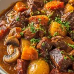 The moment you lift a spoonful of this beloved dish, you encounter a luscious, hearty stew, with chunks of melt-in-your-mouth beef coated in a velvety sauce that glistens with sophistication. The earthy aroma of mushrooms intertwines with the sweetness of cooked onions and the hearty, gamey flavor of good red wine, creating a symphony of taste that dances on your palate. Every detail brings this famous French recipe to life, drawing you in and reminding you of the beautiful traditions of home-cooked meals.