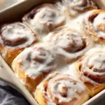 Freshly baked homemade cinnamon rolls topped with creamy icing
