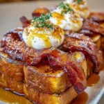Serve your golden slices piled high, topped with crispy bacon and a generous drizzle of any remaining maple syrup. Don’t forget, a dusting of powdered sugar elevates this dish to pure decadence!