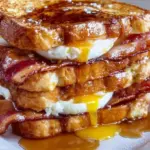 A delightful twist on classic French toast, combining sweet and savory flavors with crispy bacon, creamy filling, and a bourbon maple syrup drizzle.