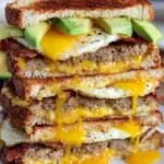 A hearty Breakfast Club Sandwich featuring crispy bacon, savory sausage, creamy scrambled eggs, and fresh avocado, all layered between toasted bread for a delightful morning meal.