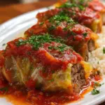 Savory cabbage rolls filled with seasoned ground beef and rice, enveloped in a tangy tomato sauce—a perfect comfort food for family gatherings.