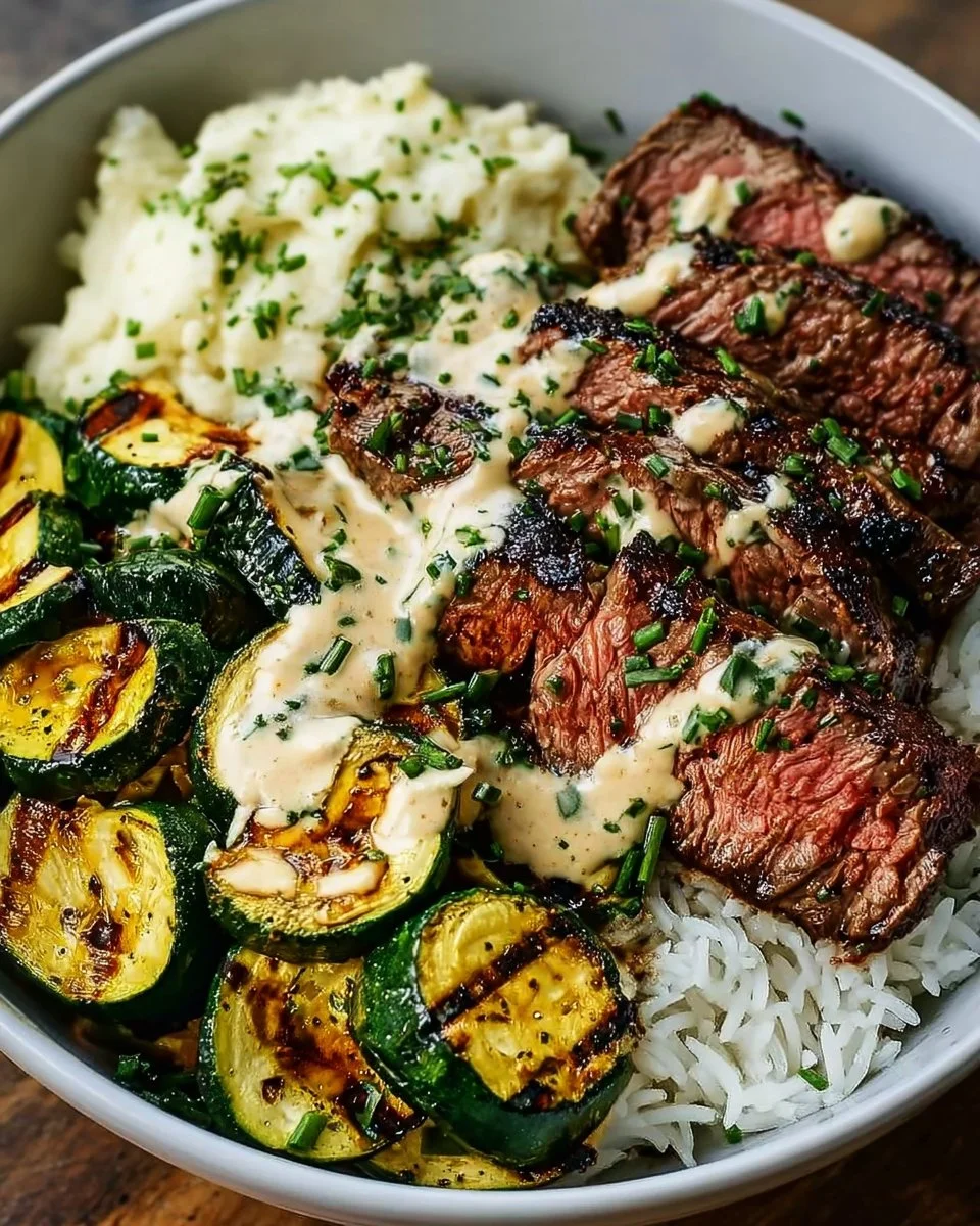Grilled Steak Bowl with Sauce & Grilled Zucchini Bliss