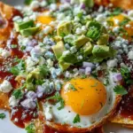 Assemble the Dish: Divide your salsa-coated chips evenly between two plates. Top each with a fried egg, then lavishly sprinkle with crumbled cheese, red onion, cilantro, and avocado slices. Finish with a generous dollop of sour cream or crema, and feel free to add optional toppings like jalapeños or radishes for an extra kick.