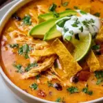 A comforting and hearty Chicken Tortilla Soup filled with vibrant vegetables, tender chicken, and topped with crispy tortilla chips, avocado, and cilantro.