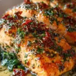 The moment you walk into the kitchen and the scent of sizzling garlic wafts toward you, something magical begins to happen. The shimmering fillets of salmon, glistening with a drizzle of olive oil, evoke a sense of anticipation that dances around the room. Each piece of fish promises a succulent, buttery bite infused with a rich, creamy sauce, speckled with bursts of flavor from sun-dried tomatoes and the earthy warmth of perfectly wilted spinach. Softening the salmon’s natural essence, the heavy cream envelops every mouthful in a luxurious embrace, promising both comfort and romance.