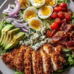 Prepare the Salad Base: While the chicken bakes, arrange the mixed salad greens attractively on a large platter. Position the cherry tomatoes, avocado, hard-boiled eggs, bacon, blue cheese, red onion, and cucumber in neat rows, creating an eye-catching presentation.